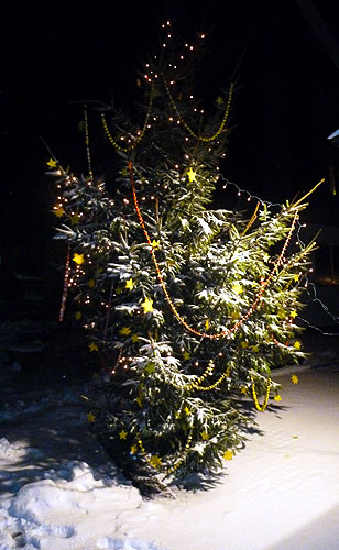 Weihnachtsbaum leuchtet vor dem "Jugendtreff"