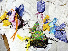 Osterhasen sowie Blumenstecker in Form von kleinen Osterhasen oder